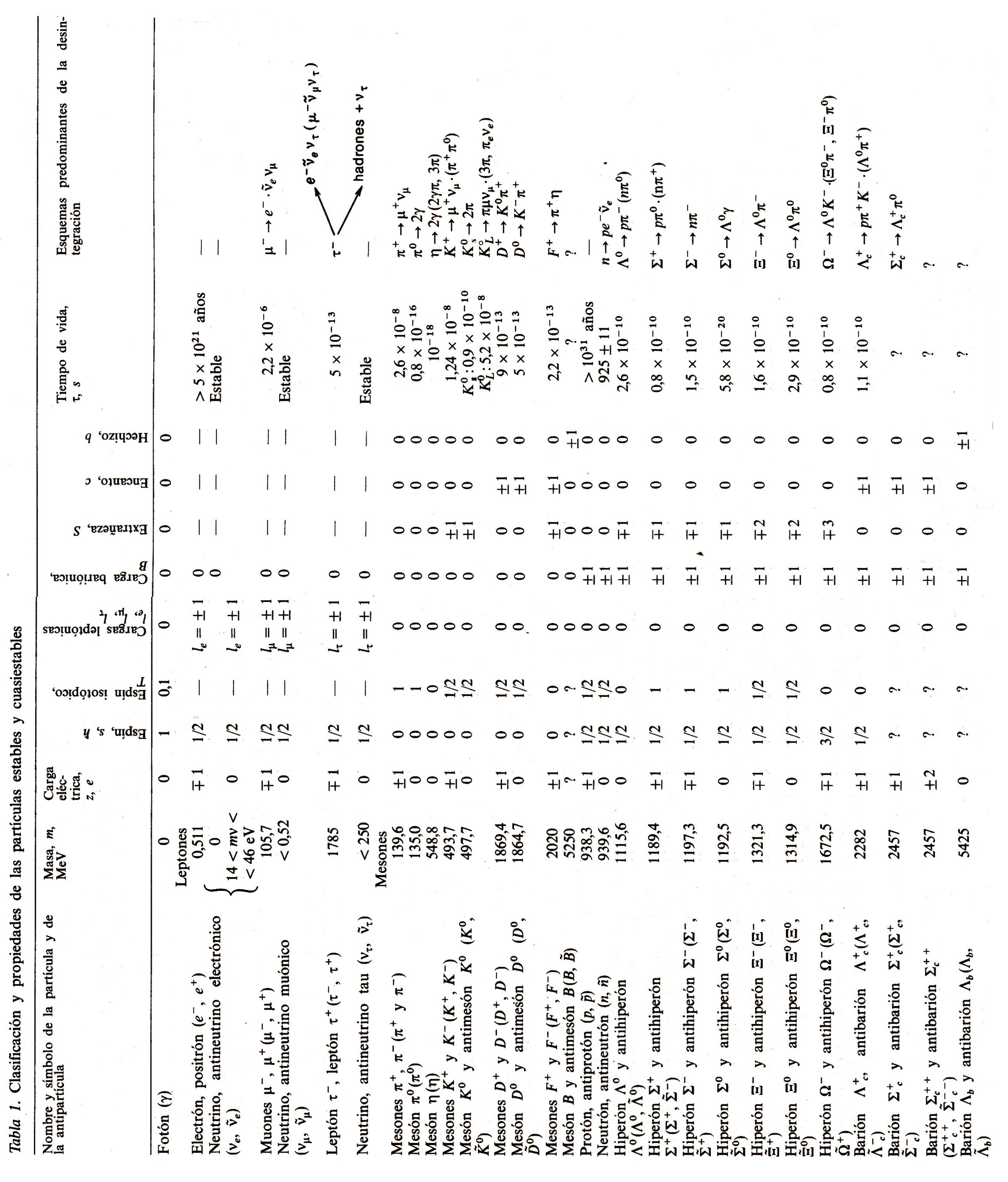 En la actualidad, en total (junto con las antipartículas) existen 55 partículas estables y cuasiestables. Las propiedades principales de estas partículas se muestran en la tabla 1. Los valores de masas de las partículas elementales se dan en megaelectronvoltios[5].