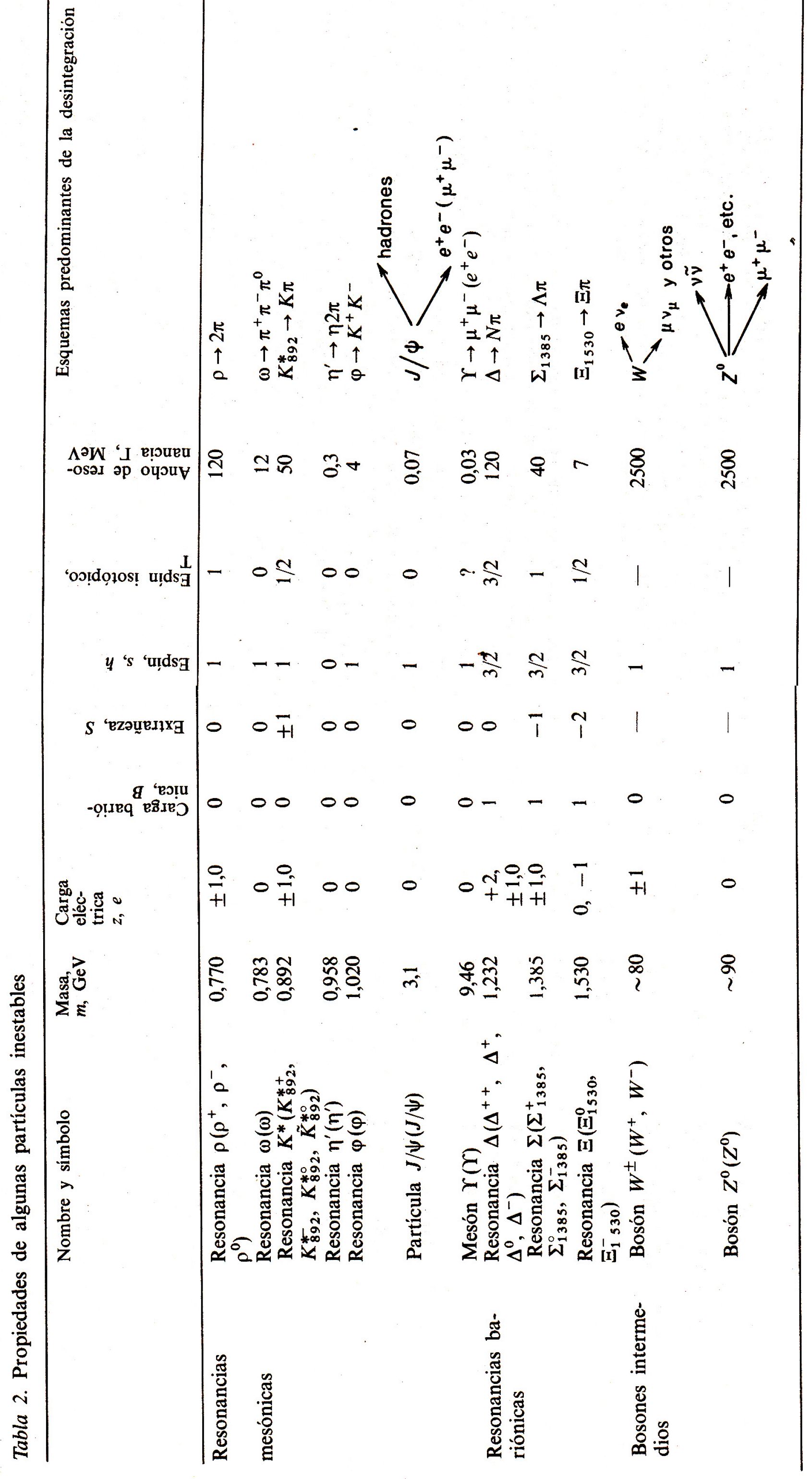 Los bosones intermedios vectoriales W± y Z° descubiertos hace poco (1982-1983) ocupan las dos últimas líneas de esta tabla. Estas partículas tienen una masa enorme (80 - 90 GeV), el espín unitario, un ancho de resonancia muy grande (G ≈ 2,5 GeV) y, por consiguiente, un tiempo de vida extraordinariamente pequeño: t ≈ h/G' = 6,6·10-16/2,5·109 ≈ 3·10-25 s. Sin embargo, este tiempo de vida sumamente pequeño resulta suficiente para que éstas puedan cumplir las funciones de cuantos de interacción débil, es decir, tener tiempo para pasar la distancia del orden del radio de interacción débil rd ≈ 2·10-16 cm.