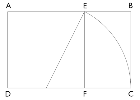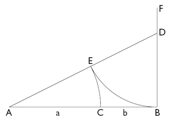 a) Dado el segmento AB, se sitúa sobre BF, perpendicular a AB, un segmento BD = AB/2, y se une A con D. Con un compás, tomando como centro D, se obtiene DE = DB. Después tomando como centro A, se traza el arco de círculo EC, siendo C el punto buscado. La longitud AB se ha dividido en dos partes iguales de forma que la mayor es a la menor como la suma de las dos es a la mayor.