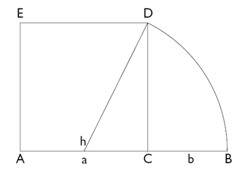 b) Dado el segmento AC, construir el cuadrado ACDE, buscar el punto medio h del lado AC, unir h con D. Con h como centro, trazar desde D, el arco de círculo que haga intersección con la prolongación de AC, con lo que se obtiene el punto B. Tenemos que: AC/CB = AB/AC a/b = a + b/a
