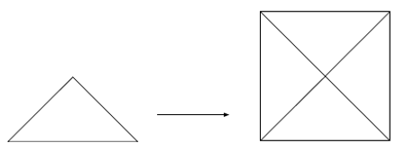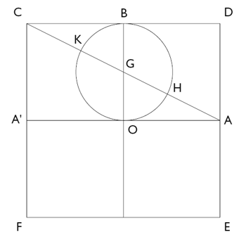 El cuadrado CDEF tiene el lado = 2 en relación a los ejes OA = OB = 1. La diagonal AC = a la diagonal del doble cuadrado CDAA' = √5, porque según el teorema de Pitágoras: