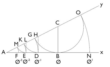La construcción de potencias positivas es igualmente sencilla: con C como centro y CE como radio se traza el arco BO; después, con A como centro y AO como radio, el arco ON, con lo que se determina el punto N. Resulta que: AC = √5/2, que CO = 1/2, y que AN = AO = AC + CO = √5+1/2= Φ . Si se sigue el mismo procedimiento, se pueden trazar sobre el prolongamiento de Ax las longitudes correspondientes a Φ 2 , Φ 3 , y sucesivas.