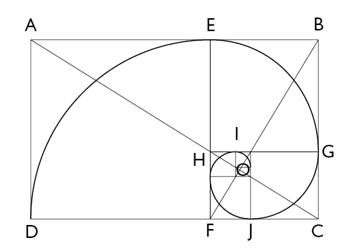 - El punto límite O se denomina polo de la espiral equiangular, que pasa por los puntos áureos D, E, G, H... He ahí la conexión entre la espiral logarítmica y la sección áurea.