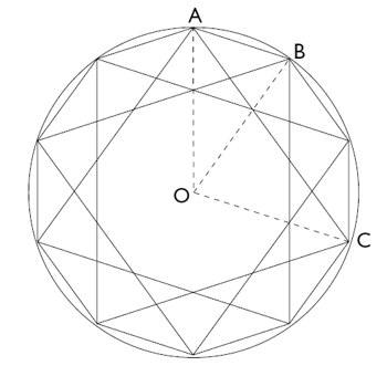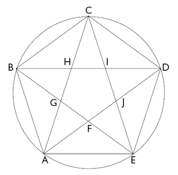 La figura representa un pentágono regular convexo (de lado AB) y un pentágono regular estrellado (de lado AC), ambos inscritos en el mismo círculo. Se demuestra que AC / AB = AB / AG = AG / GH = Φ . Es decir, la relación entre el lado del pentágono estrellado (o de la diagonal del pentágono convexo), y el lado del pentágono convexo, es igual al número de oro. También el pentagrama completo está formado por cinco triángulos isósceles sublimes (denominados así cuando el ángulo en el vértice es igual a 36°). Puesto que conocían las propiedades de esta figura en relación con la razón Φ , los pitagóricos otorgaron al pentágono, especialmente al pentagrama, un lugar preferente entre las otras figuras planas y lo convirtieron en emblema simbólico por excelencia de la salud y la vida: el 5, simétrico respecto a la unidad central y asimétrico por impar, es el resultado de la suma del primer par y del primer impar, siendo 2 el primer número femenino y 3 el primer número masculino (de ahí que algunas veces se le denominara matrimonio).