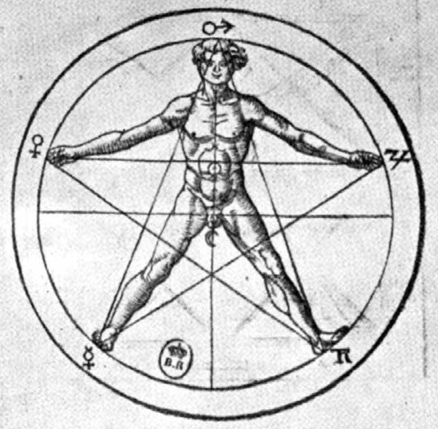 Por eso el pentagrama o pentalfa fue escogido como una contraseña de reconocimiento entre los integrantes de la secta pitagórica y también como símbolo universal de perfección, de belleza y amor. Cábala y alquimia, Medioevo y Renacimiento, tuvieron en el pentagrama el símbolo del microcosmos, el hombre físico y astral, perfectamente ajustado a la imagen del macrocosmos como dodecaedro, pues este sólido, con sus doce caras pentagonales aludiendo a los doce signos del zodíaco, fue designado por Platón en el Timeo como símbolo del Universo. He aquí la representación del hombre-microcosmos-pentágono de Henri Corneille-Agrippa, consejero e historiógrafo del emperador Carlos V, tal como aparece en su tratado De Occulta Philosophia (1533), en el capítulo dedicado a la «Proporción, Medida y Armonía del Cuerpo humano», que se inicia con estas palabras: