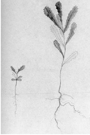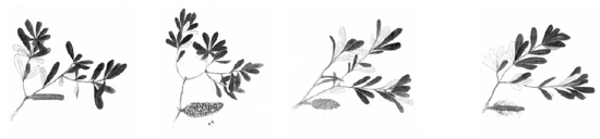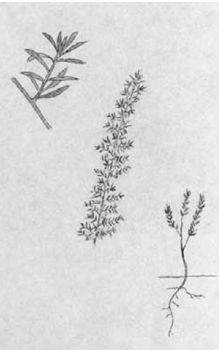 Figura 65. Kunzea ambigua. Tres aspectos de la planta. Tinta y acuarela s/p