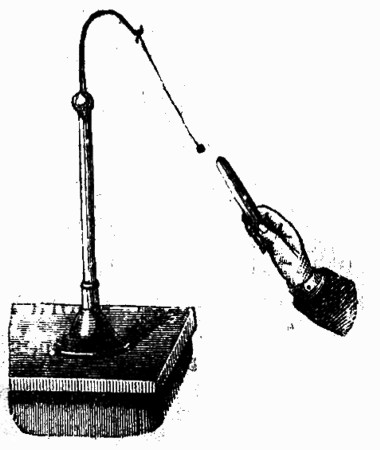 Supongamos ahora que la esferilla, al ser atraída, llegue a tocar al cuerpo electrizado; en este caso, e inmediatamente después del contacto, la esfera del péndulo será vivamente rechazada, y siempre que tratemos de acercarle el cilindro la veremos huir y apartarse de él El saúco ha quedado electrizado por el contacto; para convencernos de ello basta poner al lado sustancias ligeras, u otro péndulo no electrizado, en cuyo caso se observará una marcada atracción entre ambos cuerpos. Si se, toca la primera esfera con la mano, perderá su electricidad, y entonces volverá a ser atraída por el cilindro de vidrio.
