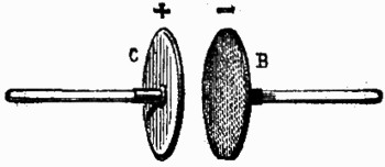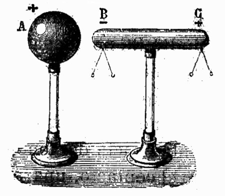 Supongamos un cuerpo A (fig. 4) electrizado positivamente. Al acercarle un cuerpo BC, no electrizado, el fluido neutro de éste se descompone; la parte positiva, huyendo de A, va a refugiarse al extremo C del segundo cuerpo, mientras que la parte negativa, atraída por A, se acumula en el extremo B. Es fácil comprobar que la electricidad, por efecto de la influencia ejercida por el cuerpo A, ha quedado distribuida en el cuerpo BC del modo que acabamos de indicar. Para demostrarlo experimentalmente, tómese un plano de prueba, que es un disco metálico como de una pulgada de diámetro, y provisto de un mango aislador, y tóquese con él la parte C del cuerpo BC; el plano de prueba quedará cargado, por contacto, de la misma electricidad que exista en C, y que nosotros aseguramos que es positiva.