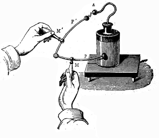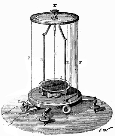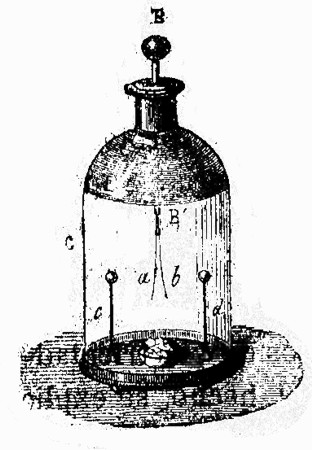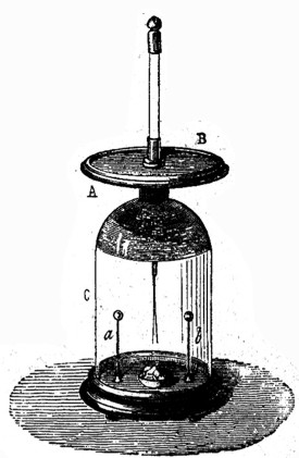 Antes de entrar en el estudio de las máquinas eléctricas y de los condensadores, conviene que describamos el sencillo instrumento denominado electroscopio, instrumento que sirve para determinar la naturaleza de la electricidad desarrollada en un cuerpo. Este aparato está fundado en la repulsión que mutuamente experimentan dos cuerpos cargados de una misma electricidad. Si se toman dos hojuelas de oro y, después de suspendidas de una hebra de seda, se les comunica, por contacto, una carga de electricidad cualquiera entonces se observará que las hojas, primeramente verticales 'y unidas, se separan formando un ángulo.
