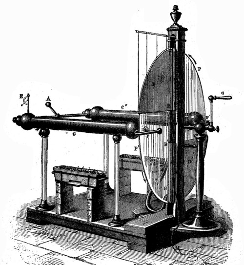 La primera máquina eléctrica inventada fue la de Otto de Guericke. Componíase de un globo de azufre que giraba alrededor de un eje horizontal. La mano seca servía de frotador. El globo de azufre fue después sustituido por esferas de vidrio, y éstas por cilindros también de vidrio. La máquina hizo algo más complicada cuando se le añadió el conductor principal, que era un tubo de estaño, aislado por resina o por hebras de seda, y destinado a recoger la electricidad producida por el cuerpo frotado.