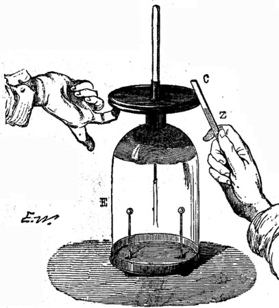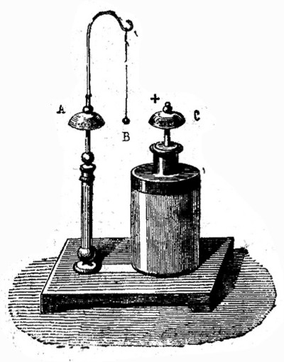 Veamos ahora como se procede para determinar con este instrumento la naturaleza del fluido eléctrico desarrollado en un cuerpo. Para ello se comienza por cargar el instrumento con una electricidad' conocida. Acercando, por ejemplo, un cilindro de vidrio electrizado a la esfera B, y tocando ésta con el dedo, la electricidad positiva, desarrollada por inducción irá a parar al suelo, y el instrumento quedará cargado de electricidad negativa, es decir, de electricidad contraria a la del cuerpo inductor, como era fácil prever.