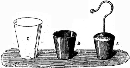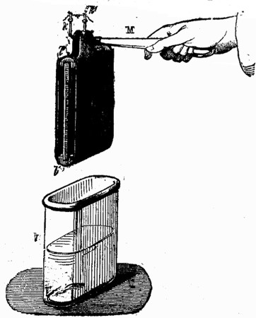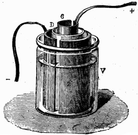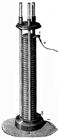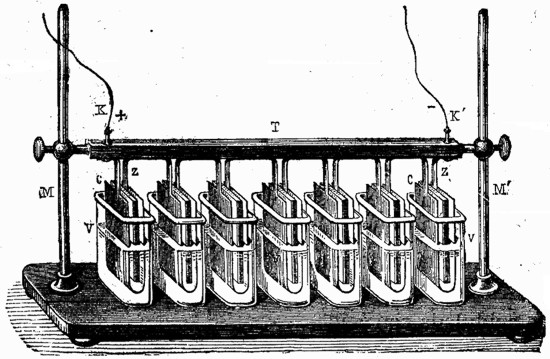 El fenómeno de la descomposición de los cuerpos binarios, tales como loe óxidos metálicos, lo mismo que el de la descomposición de las sustancias salinas, fue conocido por los físicos desde la invención de la pila de Volta; pero el depósito metálico, que se formaba, era pulverulento y podo adherente, e impropio, por lo tanto, para aplicaciones industriales. Científicamente, sin embargo, era muy importante aquel hecho, gracias al cual se han aislado metales nuevos, enriqueciendo con su descubrimiento las ciencias químicas. Las pilas de dos líquidos producen depósitos más consistentes y homogéneos que las otras, y observando estos depósitos, y variando los experimentos, fue como el ilustre físico ruso Jacobi llegó a descubrir la galvanoplastia, Había empleado, en sus experiencias relativas a los motores eléctricos, pilas de Daniell, formadas de placas de cobre muy puro para el electrodo positivo, y de platino para el negativo, y hubo de notar, no sin sorpresa, que sobre el platino se había formado un depósito rugoso de hojuelas de cobre, cuya superficie interna reproducía en hueco, con matemática exactitud, los relieves e irregularidades del platino. Variando, como hemos dicho, los experimentos, obtuvo depósitos más homogéneos y consistentes, y sustituyendo la lámina de platino por moldes de medallas, grabados en hueco, etc., llegó a reproducir las medallas y grabados originales con toda perfección.
