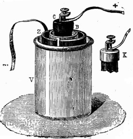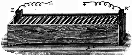 Al hablar, en la primera parte de este libro, de las pilas de un solo liquido, no hicimos mención de una de las causas que más contribuyen a debilitar gradualmente la corriente eléctrica obtenida en ellas; esta causa es le producción de depósitos gaseosos, ácidos o alcalinos en las planchas metálicas. Por efecto de la formación de estos depósitos, origínanse en las pilas ciertas corrientes, denominadas secundarias, que son de sentido inverso que las principales. Obsérvanse también las corrientes secundarias en las planchas de platino que sirven de electrodos, al descomponer el agua por la pila, observación que fue hecha por vez primera el año 1826 por el famoso físico de Ginebra Mr. de la Rive. Ya desde 1803 había descubierto Ritter esas corrientes, enlazando entre sí dos pilas de columna. una de las cuales se componía exclusivamente de discos de cobre, separados por rodajas húmedas; en esta pila se producía, al interrumpir la corriente engendrada en la otra, una corriente secundaria, débil, y poco durable. Algunos otros físicos se han ocupado también en el estudio de estas corrientes, debiendo citar especialmente a Mr. Planté, que ha sido el primero en buscar y encontrar las aplicaciones prácticas de esta nueva manifestación de la electricidad.