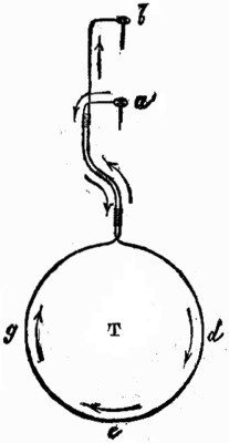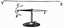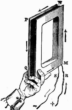 Como toda acción va acompañada de una reacción, sucede que, si la punta rechaza al aire, éste a su vez reobrará sobre la punta. En este principio está fundado el torniquete eléctrico. Compónese este aparato de cierto número de varillas metálicas, colocadas horizontalmente y dispuestas como los radios de un círculo y encorvadas todas en el mismo sentido. El sistema de varillas puede girar libremente alrededor de un eje vertical fijo en una máquina eléctrica. En cuanto se comunica a esta máquina una carga de electricidad, el fluido tiende a escaparse por las puntas de las varillas; el aire, como hemos dicho, es rechazado y, reobrando sobre las puntas, las hace girar en sentido contrario al rededor del eje