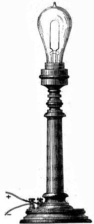 Hemos dicho que el tornillo que se ve en la parte inferior de la figura 82 servía para colocar la lámpara en un candelabro o pernada, o en cualquiera otro aparato que se adoptase. La figura 83 representa un .candelabro provisto de su correspondiente lámpara. En la parte inferior de la figura se ven los dos tornillos de presión por donde la lámpara se comunica con el circuito eléctrico.