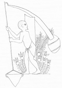 UN POTENTE IMPLEMENTO PRIMITIVO. Combinando la fuerzo muscular y el «shaduf», una especie de palanca, los egipcios elevaban agua del Nilo paro la irrigación de las tierras más altas que el nivel del río, Este dibujo de una tumba de hacia 1500 a.C. muestra o un labrador bajando un cubo en forma de cono, que cuelga de una viga equilibrado entre dos pilares. El contrapeso colocado al otro extremo de la viga permitía al labrador levantar el cubo lleno con menos esfuerzo.