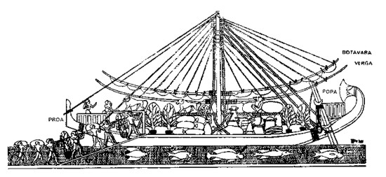 UN NAVEGANTE SOFISTICADO. La atracción de cargamentos valiosos más allá de Egipto condujo a lo construcción de buques más complejos que el que se ve aquí. Treinta remeros ayudaban a propulsar el buque que data de 1500 a.C. El aparejo permitía arriar las velas mientras el buque estaba anclado. Se hacia bajando la varga superior hasta la botavara. Las cuerdas que van de las vergas al mástil servían para izar la vela. Otros aparejos de proa y popa servían para sostener el mástil.
