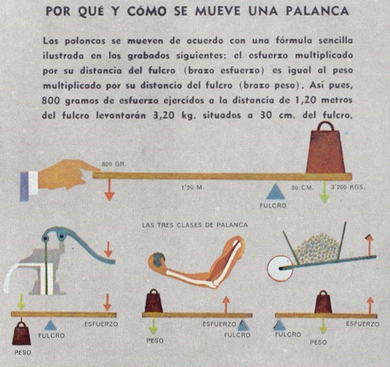 Un hombre no puede mover una roca sólo con las manos. Sin embargo, cuando mete un pie de cabra debajo, aproxima una piedra bajo éste para que sirva de punto de apoyo, entonces pinza hacia arriba y la roca se mueve. El pie de cabra y el fulcro forman una palanca, proporcionándole lo que los físicos llaman « ventaja mecánica », que permite a sus limitados recursos de fuerza superar la resistencia de la roca. Con sus manos un hombre puede quizás aplastar una lata de cerveza; sin embargo, tocando simplemente un botón, una prensa hidráulica reducirá una carrocería de acero de un automóvil de 500 kilos de peso a una apretada bala del tamaño de un pupitre de escuela. Con un brazo fuerte, un hombre puede lanzar una piedra a la distancia de 30 metros, pero apretando un botón puede hacer que una máquina lance un cohete de 150 toneladas, con su contenido, a más de 6.500 millas de distancia sobre el Atlántico, dando en la diana de un blanco predeterminado. Una máquina electrónica consigue en pocos segundos hacer cálculos que él no podría realizar en varios años. Una máquina alada le lleva volando una cuarta parte del perímetro de la tierra en el tiempo que a él le llevaría caminar 20 kilómetros.