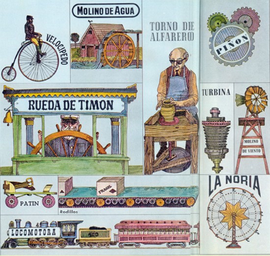 La rueda de agua, molino y turbinas (dibujos a la izquierda) todos convierten la energía cinética de una sustancia en movimiento (agua, aire, vapor, en la energía mecánica de un eje en rotación. La rueda del alfarero puede ser lo primera utilizada par el hombre. Algunas de las ruedas que aquí aparecen, son rodillos pasivos, es decir, ruedan simplemente en vez de ser rueda y eje, palancas circulares. Por ejemplo: las ruedas de los polines, la rueda trasera del biciclo, las ruedas pequeñas de la correa de rodillos, y todas las ruedas de un tren excepto las cuatro motrices. La correa de rodillos va movida par sus ruedas dentadas.