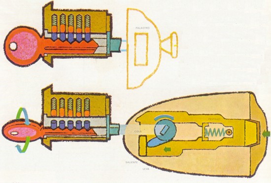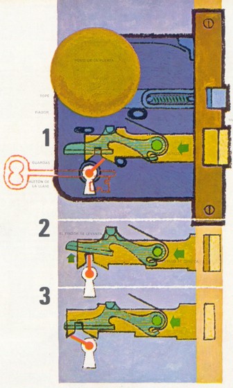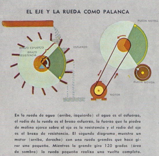 Uno de los primeros usos de esta máquina elemental para el hombre fue en el molinete, para mover pesos que eran demasiado pesados para ser movidos a mano. Ató una cuerda al peso y después sujetó el otro extremo a un eje. Unos mangos en la rueda del eje le permitieron hacerla girar. Lo mismo que en una palanca, la cantidad de fuerza está en razón de dos longitudes: la del radio del eje y la del radio de la rueda. Y lo mismo que las palancas pueden ser movidas por otras palancas, asimismo la ventaja mecánica de la rueda y el eje se puede aumentar utilizando una serie de ruedas engranadas de diferentes tamaños (izquierda). La notable versatilidad de estas palancas de 360° está claramente demostrada en las diversas formas en que la rueda y el eje están colocados en muchos ingenios populares en los que jamás pensaríamos fueran ruedas, un destornillador, un grifo del agua, una llave en su cerradura.