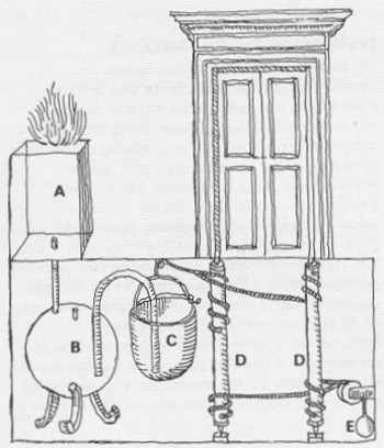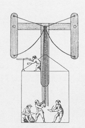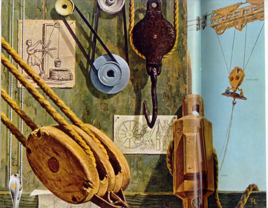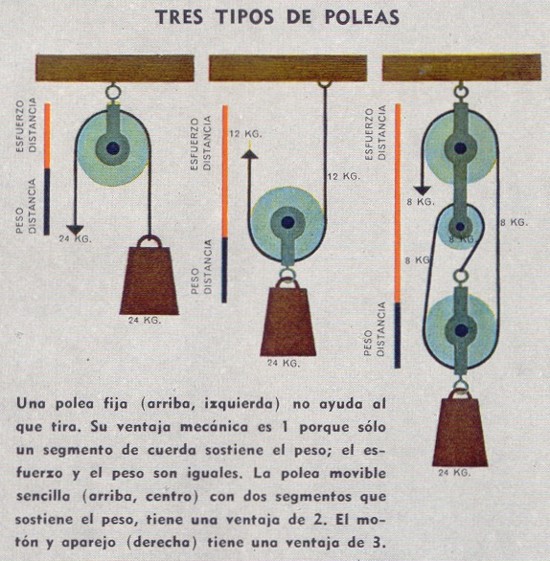 "Si queremos mover cualquier peso, atamos una cuerda a este peso y... tiramos de la cuerda hasta que lo levantamos. Para esto se necesita una fuerza igual al peso que deseamos levantar. Sin embargo, si desatamos la cuerda del peso y atamos un extremo en una sólida viga, pasamos el otro extremo por una polea que vaya sujeta al centro del peso, y tiramos de la cuerda, moveremos más fácilmente el peso."