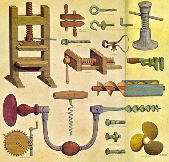 Aunque las máquinas se han multiplicado enormemente, todavía la lista más reciente tiene que dar principio con los cinco ingenios enumerados por el genio inventivo griego, Herón de Alejandría, alrededor de la era de Jesucristo: la palanca, la rueda y eje, la polea, la cuña y el tornillo.