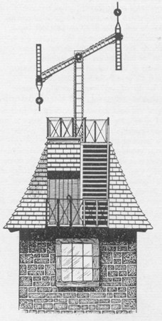 UNA COLECCIÓN DE POLEAS. El molinete y polea para sacar agua de un pozo (grabado izquierda) es uno de los usos más antiguos de la polea fija simple. Los romanos mejoraron esta grúa primitiva reemplazando el molinete por una noria. El motón y aparejo usan poleas múltiples, como se ve en el motón de dos roldanas que domina el grabado. Los demás dibujos muestran un motón con un agujero para un gancho; tres poleas motrices de diferentes tamaños conectadas por correas flexibles para que cambien las velocidades de rotación de cada una; una polea fija; un aparejo en forma de elevador de funicular; y una polea elevadora simple.