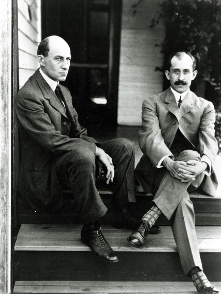 En una expresiva fotografía, como todas las que se conocen de los dos hermanos Wright, aparecen sentados uno junto al otro en los escalones del porche trasero de la casa de su familia, situada en una bocacalle de la parte occidental de Dayton, en Ohio. Corría el año 1909, estaban en el apogeo de su fama. Wilbur tenía cuarenta y dos años, Orville treinta y ocho. Wilbur, de rostro alargado y con cara de póquer, mira a un lado como pensando en otras cosas; lo que con toda probabilidad estaba haciendo. Calvo y bien afeitado, es enjuto, casi desgarbado, de nariz y mentón prominentes. Su vestuario —lleva un sencillo traje oscuro y unos botines de cordones— es muy similar al del padre de ambos, que era predicador.Orville mira directamente a la cámara cruzando una pierna sobre la otra, relajado. Es un poco más robusto que su hermano y parece algo más joven; también tiene algo más de pelo y un bigote bien cuidado. Lleva un traje de color más claro y corte apreciablemente mejor, elegantes calcetines de cuadros y zapatos de cordones. Esos cuadros eran casi lo más llamativo que un varón de la familia Wright podía llevar. En su pose también destacan —como no podía ser menos— sus diestras manos: las mismas que, cuando se tomó la foto, ya habían contribuido a cambiar portentosamente el mundo.