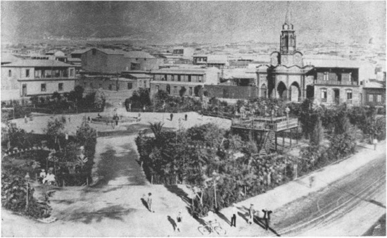 Plaza Colón de Antofagasta, a fines del siglo pasado (1895 a 1898). Fotografía proporcionada por el Departamento de Extensión Cultural de la Universidad de Chile (Antofagasta).