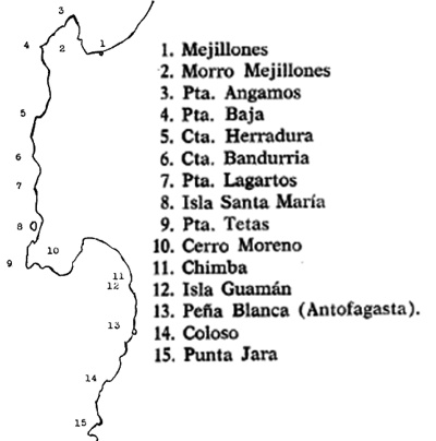 —Bahía Algodonales, Duendes (Duendas en el plano), Punta Blanca, Guanillos, Cobija, Gualaguala, Bahía de Mejillones, Punta Tetas, Bahía Jorge, Cerro Moreno, Playa Brava, Punta Jara, etc.
