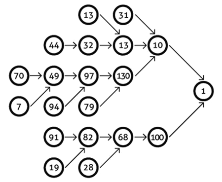 Aquí le propongo que usted haga algunas cuentas para descubrir cuántos números felices hay entre 1 y 100. Yo dibujaré un diagrama con todos los que hay, y la forma en la que están ligados, pero usted haga su propio diagrama, no mire lo que sigue. ¿Qué gracia tendría? En todo caso, use los resultados que figuran para corroborar que los que descubrió son todos los que hay.