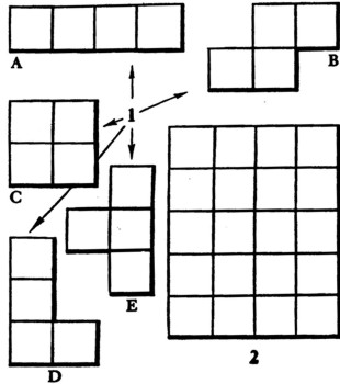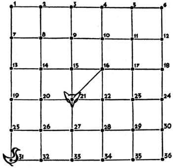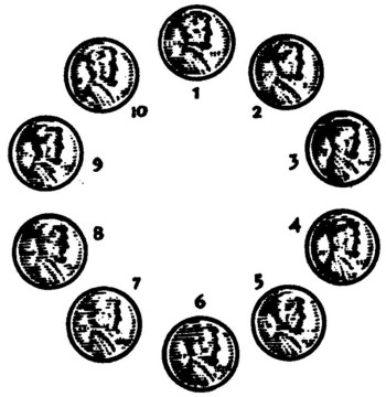 - Coloca una moneda en cada uno de los sitios que muestra la ilustración adjunta. ¿Puedes cambiar la posición de sólo una moneda y formar dos filas rectas que contengan cuatro monedas cada una?