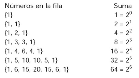 La suma de los números que aparecen en cada una de las filas reproduce la potencia de 2 correspondiente al número de fila.