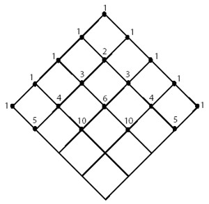 Lo notable es que si uno gira 45 grados esta figura, en el sentido de las agujas del reloj, e imagina que tiene dibujada una parte del triángulo de Pascal, y ubica en cada intersección el número que corresponde al triángulo, obtiene exactamente el número de caminos posibles con las reglas establecidas.