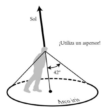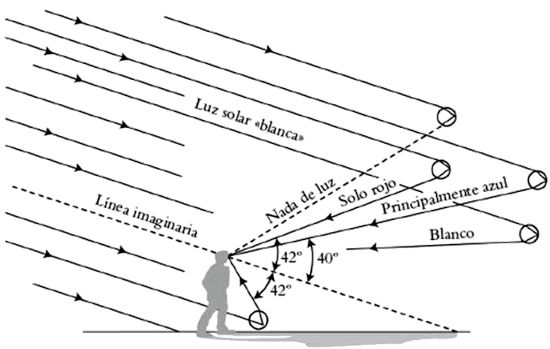 Basta con que mires al cielo y te hagas unas preguntas obvias: ¿Por qué el cielo es azul, los atardeceres rojos y las nubes blancas? ¡La física tiene las respuestas! La luz solar se compone de todos los colores del arco iris, pero a medida que atraviesa la atmósfera se dispersa en todas direcciones al chocar con las moléculas del aire y con minúsculas partículas de polvo (mucho más pequeñas que una micra, que es una diezmilésima de centímetro). Es lo que se conoce como dispersión de Rayleigh. La luz azul es la que más se dispersa, unas cinco veces más que la roja. Por tanto, cuando miras al cielo durante el día en cualquier dirección[3] predomina el azul y por eso tiene ese color. Si miras al cielo desde la superficie de la Luna (quizá hayas visto fotografías), no es azul, sino negro, como el nuestro por la noche. ¿Por qué? Porque la Luna no tiene atmósfera.