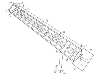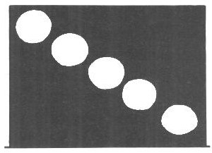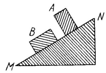 Una de dos bolas iguales desciende por un plano inclinado y la otra, por los bordes de dos tablas de sección triangular dispuestas paralelamente. La pendiente del plano y la altura del punto de partida son iguales para ambos cuerpos.