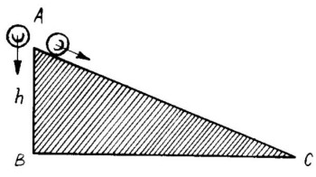 Ante todo, vamos a señalar que la reserva inicial de energía potencial de ambas bolas es igual, puesto que tienen idénticas masas y descienden desde una misma altura. Pero hay que tener en cuenta que para la que rueda por entre dos tablas, el radio del círculo de rodadura es menor que para la otra que desciende por el plano (r2 < r1 ).