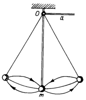 Supongamos que a una tabla que puede deslizarse verticalmente hacia abajo por las ranuras practicadas en dos montantes: está fijada por los extremos una cadena; está fijado un péndulo desviado hacia un lado respecto de la posición de equilibrio; está fijado un frasco abierto con agua.