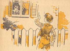 La anciana giró en redondo, recogiéndose las faldas para esquivar el peligro; y en el mismo instante escapó el chico, se encaramó por la alta valla de tablas y desapareció tras ella. Su tía Polly se quedó un momento sorprendida y después se echó a reír bondadosamente.
