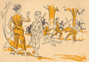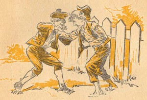 En el mismo instante rodaron los dos chicos, revolcándose en la tierra, agarrados como dos gatos, y durante un minuto forcejearon asiéndose del pelo y de las ropas, se golpearon y arañaron las narices, y se cubrieron de polvo y de gloria. Cuando la confusión tomó forma, a través de la polvareda de la batalla apareció Tom sentado a horcajadas sobre el forastero y moliéndolo a puñetazos.