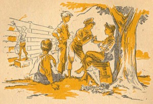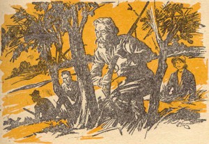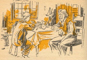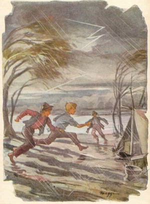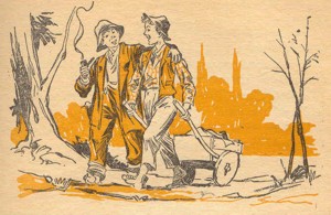 -¡Magnífico! Veníos conmigo, chicos, que estáis haciendo esperar a todos. ¡Hala, deprisa! Yo os llevaré el carro. Pues pesa más de lo que parece... ¿Qué lleváis aquí, ladrillos o hierro viejo?