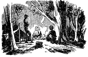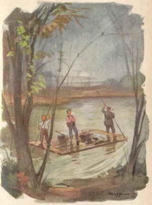 Aparecieron después en la espesura del matorral. Miraron cautelosamente en tomo, vieron que no andaba nadie por allí, y poco después estaban almorzando en el bote. Cuando el sol descendía ya hacia el ocaso desatracaron y emprendieron la vuelta. Tom fue bordeando la orilla durante el largo crepúsculo, charlando alegremente con Huck, y desembarcaron ya de noche.