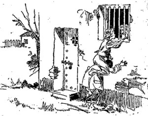Fue hasta la puerta y se detuvo allí, recorriendo con la mirada las plantas de tomate y las hierbas silvestres que constituían el jardín. Ni sombra de Tom. Alzó, pues, la voz a un ángulo de puntería calculado para larga distancia y gritó:
