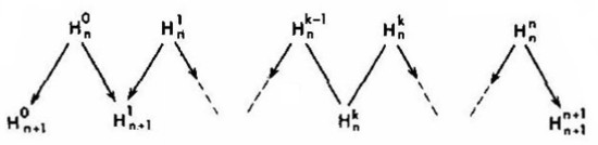 Veamos ahora cómo se vinculan entre sí los números H k n ( k = 0, 1, 2,..., n ) y H k n+1 ( k = 0, 1, 2, ..., n+1) a condición de que existan todos. Más tarde veremos que si existen y son pares todos los números H k n , existen también todos los números H k n+1 . Consideremos las filas n y ( n + 1) de los cruces y los tramos de los caminos que los unen; pongamos frente a cada cruce la designación del número respectivo de hombres (véase la figura 2). El número de hombres que salieron del cruce 0 de la fila n (es decir, H 0 n ) se dividirá en dos partes iguales y una mitad llegará al cruce 0 de la fila ( n + 1); por eso,