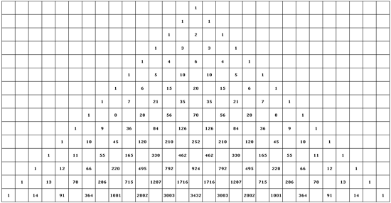 Escribamos las líneas de Pascal, partiendo de la de cero, una debajo de la otra, de modo que cada número de cada línea resulte puesto entre los números de la línea anterior la suma de los cuales es este número. Obtendremos una tabla infinita que se llama triangulo aritmético de Pascal, o sencillamente, triangulo aritmético o el de Pascal. Toda la tabla en total parece rellenar la parte interior de cierto ángulo; todo su principio, formado por las líneas 0, 1,..., n , tiene la forma del triangulo. Más adelante se representa el principio del triángulo de Pascal formado por sus primeras 15 líneas, desde 0 hasta 14.