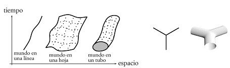 Figura A3. (Figura de la izquierda). El mundo en una línea de una partícula, el mundo en una hoja de una cuerda abierta y el mundo en un tubo de una cuerda cerrada. (Figura de la derecha). Interacciones de tres partículas y de tres cuerdas.
